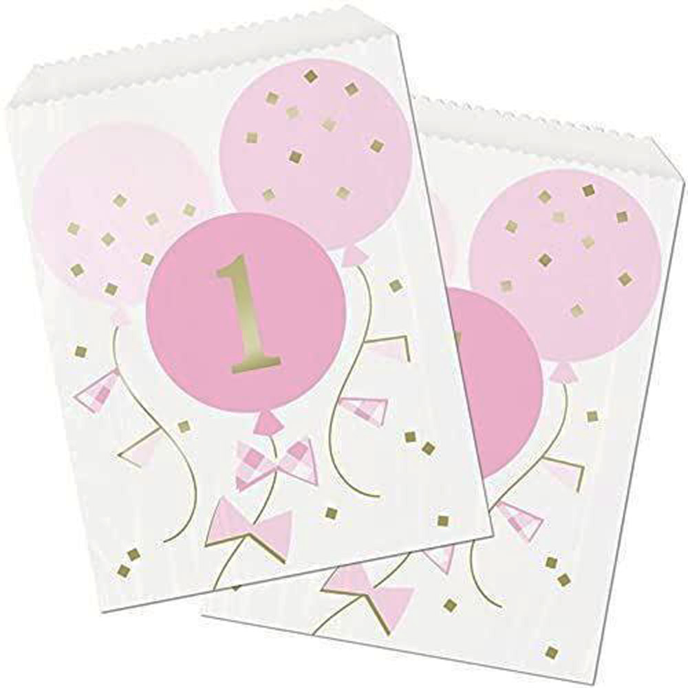Slikposer til 1. Fødselsdag – Pige. 8 stk. I Papir er essentielle til din lille prinsesses første fest. Disse papirslikposer har et farverigt design med lyserøde balloner og et stort 1-tal. Der skaber en festlig stemning.